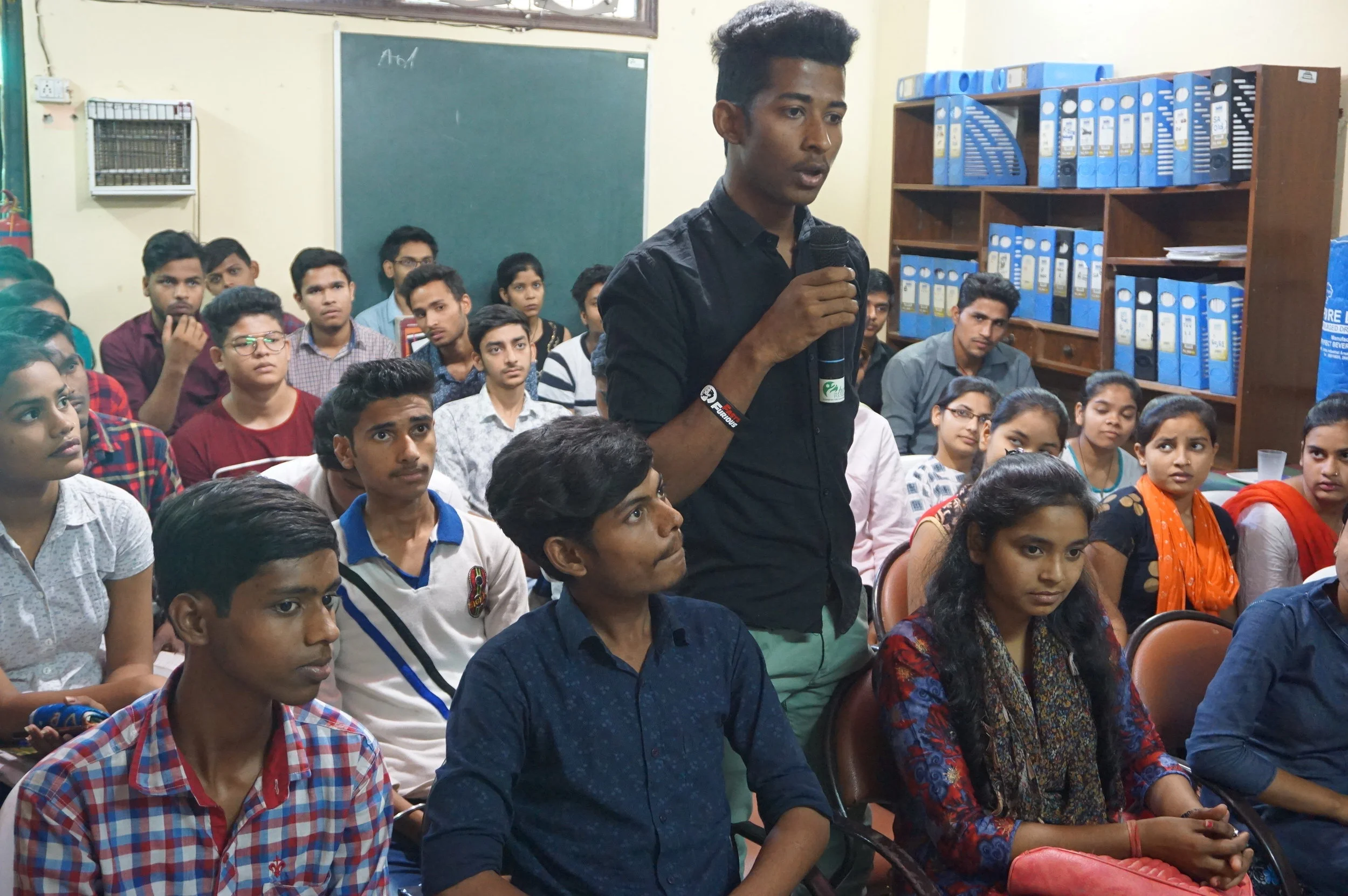 A student of Adharshila speaks during AES visit while the students from the school watch and encourage the participants